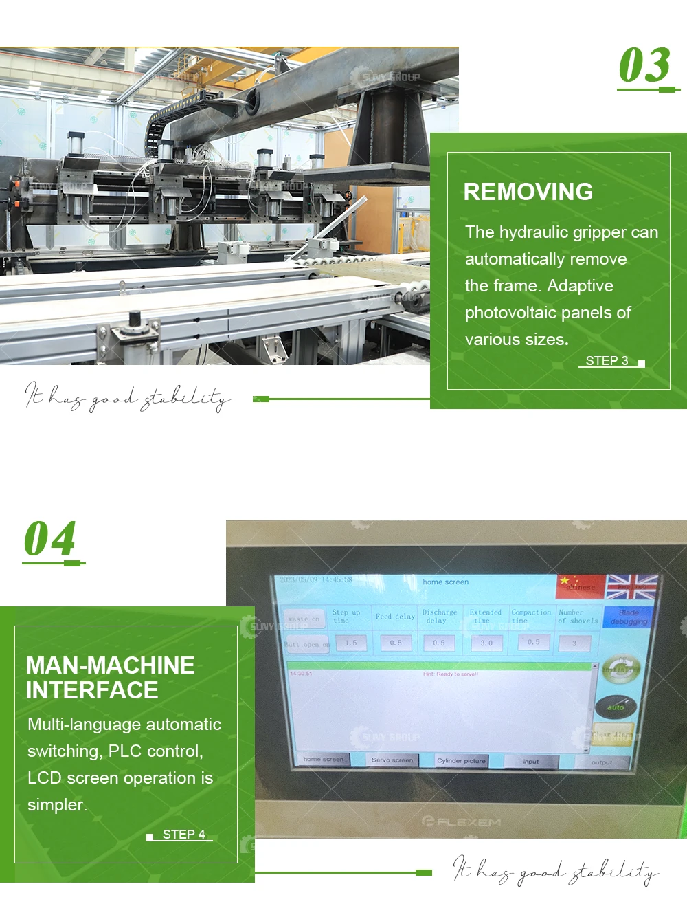 The Suny Group Solar Panel Fully Automatic Frame Removal Machine is designed to streamline and simplify the recycling of end-of-life photovoltaic (PV) modules. By automating the process of detaching aluminum alloy frames from solar panels, this equipment makes it easy to recover valuable materials for reuse — helping advance circular economy goals in the solar industry.