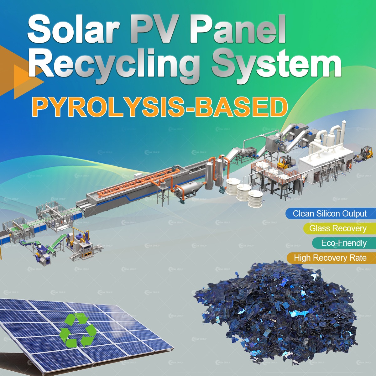 Suny Group Solar Panel Waste Pyrolysis Recycling Line is an advanced system designed to recover valuable materials from end-of-life photovoltaic modules through a controlled high-temperature pyrolysis process. This technology efficiently separates and purifies components such as silicon wafers, silver, copper, aluminum, and high-quality glass while breaking down EVA and other polymers without generating secondary pollution.